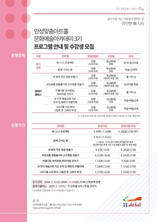 모집기간은 22일부터 24일까지 안성맞춤아트홀 홈페이지 및 현장에서 선착순으로 모집한다. 기타 자세한 프로그램에 대한 안내는 안성맞춤아트홀 문화예술아카데미로 문의하거나 홈페이지를 참고하면 된다.