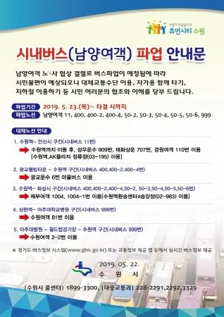 남양여객이 오는 23일 첫차부터 파업을 예고하면서 수원시가 시민들에게 대체 버스노선을 알린다.