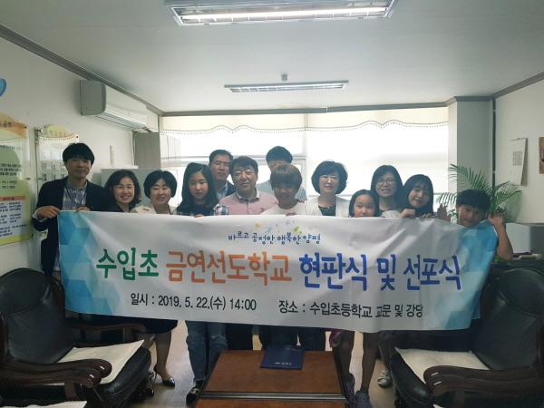 금연선도학교 현판식에는 보건소장, 건강증진팀장 및 수입초등학교 교장, 교감, 교사, 학생대표 등 20여명이 참여했으며 선포식은 학생대표가 평생금연서약서를 낭독하고 전교생이 서명한 서약서와 금연선도학교 지정서를 보건소와 학교에 각각 전달하는 방식으로 이루어졌다.
