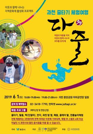 과천시는 줄타기보존회와 함께 오는 6월 1일 중앙공원 분수대 주변과 야외공연장 일원에서 ‘과천 줄타기 체험여행 다줄’ 행사를 개최한다고 밝혔다.