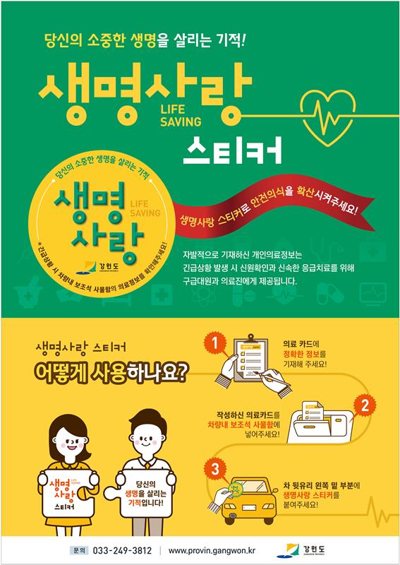 생명사랑 스티커 보급 캠페인은 “최소의 비용으로 고귀한 생명을 살리는 기적’으로 불리는 미국의 옐로우 닷 프로그램을 우리 환경에 맞추어 도입한 것으로, 차량운전자와 동승자의 의료기록을 비상상황 발생시 응급조치에 활용하게 해 생명존중을 실천할 수 있는 방안이다.