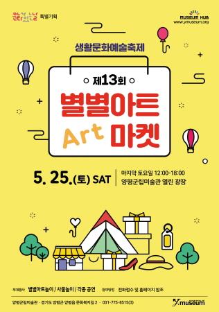 양평군립미술관은 2019 가정의 달 특별기획전시 ‘가족의 정원’전 기간인 오는 25일 1일간 차별화된 미술시장인 지역생활문화축제 제13회 별별 아트마켓을 미술관 앞 열린 광장에서 지역예술가들인 셀러 70여명과 함께 개최한다고 밝혔다.