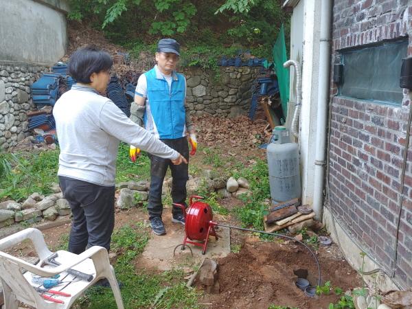 장흥면의 신OO씨는 93세의 노모와 단둘이 생활을 하고 있는 가구로 하수구가 막혀 생활의 어려움을 호소했다. 생활수 사용 시 물이 역류해 생활전반에 불편을 겪고 있으나 경제적인 어려움으로 사설업체에 의뢰를 할 수 없는 상황이었다.