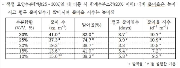 연구 결과, 토양 수분이 25~30%이면 물대기를 하지 않은 때보다 발아율이 36~43% 높았다. 토양 수분이 30%이면 싹 트는 날도 15%일 때보다 1.7일 빨랐다.