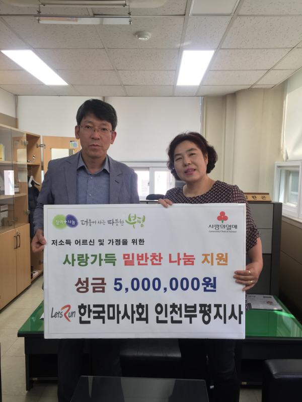 부평구 부평5동 새마을부녀회는 24일 한국마사회 인천부평지사로부터 ‘사랑가득 밑반찬 나눔’ 사업을 위한 성금 500만원을 전달받았다고 밝혔다.