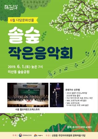 신현동 문화마을 다담은 5월 문화가 있는 주간 행사의 일환으로 오는 6월 1일 오후 7시 미산동 솔숲공원에서 시흥벨모아윈드오케스트라와 함께 ‘솔숲 작은 음악회’를 개최한다.