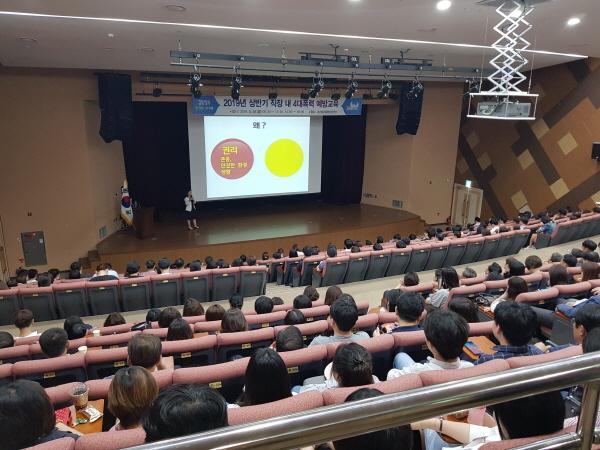 이날 교육은 직장남녀연구소 정희영 소장을 강사로 초빙해 성 평등과 젠더기반 폭력의 원인을 성인지 관점에서 설명하고 폭력의 특성과 실태를 현장 중심의 실제 사례를 통해 현실감 있게 전달했다.