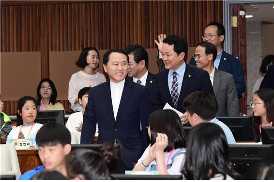이날 청소년 의회교실에는 서울중부교육지원청 관내에 소재한 32개초등학교 5~6학년 학생 약 100여명이 참여해 2분 자유발언과 모의의회를 통해 직접 조례안을 처리하는 등 일일 어린이 시의원으로서 의정활동을 경험했다. 모의의회 이후에는 학부모 50여명이 함께한 가운데 청소년 의회교실 수료증 수여식과 기념사진촬영이 진행됐다.
