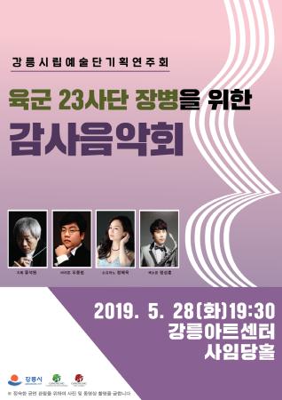 이번 음악회는 지난 4월 4일 강릉시를 비롯한 강원산불 피해 복구를 위해 전력투구하며 고생한 육군 23사단 장병을 위해 강릉시립예술단 주최로 감사음악회를 마련해 군장병을 격려하고 위로하고자 기획됐다.