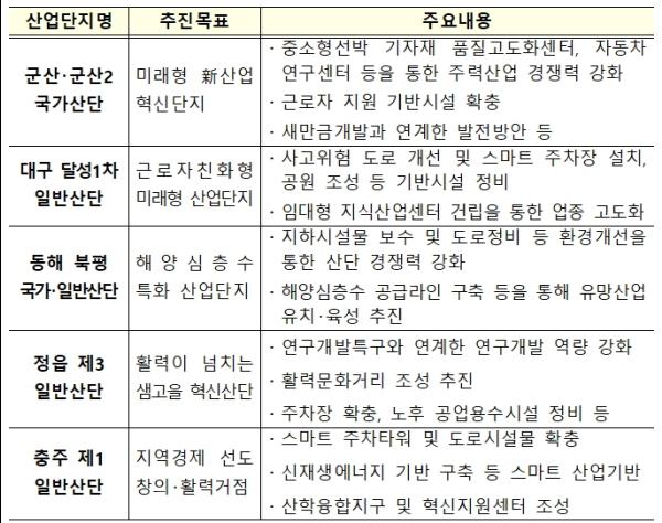 선정된 지자체는 스마트 기술을 활용한 기반시설 재정비 계획과 지역산업에 특화된 산업육성 계획을 제시하고 있어 노후산단이 지역산업의 혁신거점과 지역경제의 활력소로 자리매김할 것으로 기대되며, 사업지구별 주요 사업내용은 아래와 같다.