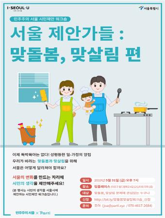 서울시는 오는 31일 저녁 7시 마포구에 있는 팀플레이스에서 ‘맞돌봄, 맞살림’에 대해 시민들이 생각하는 다양한 이야기를 풀어내기 위해서 시민 제안 발굴 워크숍을 개최한다고 밝혔다. 이번 워크숍은 서울시가 운영하는‘민주주의 서울 플랫폼’을 통해서 진행한다.
