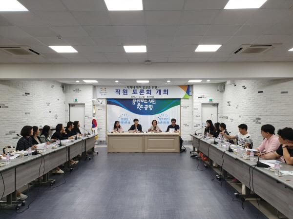 이날 토론회는 초등학생 이하 2명 이상의 자녀를 키우는 직원 140여명 가운데 희망자 40여명이 참석했으며, 자녀를 키우면서 겪는 어려움과 다자녀 지원 정책에 대한 의견을 듣고자 마련됐다.