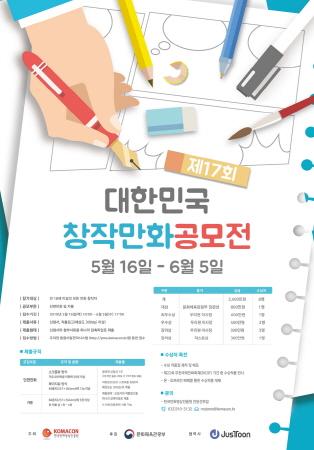 올해로 17회를 맞는 대한민국창작만화공모전은 만 18세 이상의 모든 만화 창작자는 누구나 참여 가능하며 자유 주제로 단편만화 및 카툰 부문의 응모작을 모집한다.