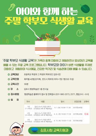 김포시는 오는 6월 1일부터 6월 15일까지 매주 토요일 관내 초등학생과 학부모를 대상으로 김포시평생학습관에서 “우리 아이와 함께 하는 주말 학부모 식생활 교육” 강좌를 3회에 걸쳐 진행한다.