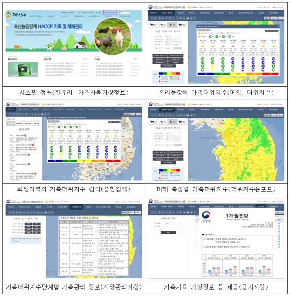 가축사육 기상정보시스템은 기상청 동네예보와 연계해 실시간 제공하는 '가축더위지수'를 바탕으로 무더위에 가축을 관리하는 방법과 지침을 제시하고 있다.