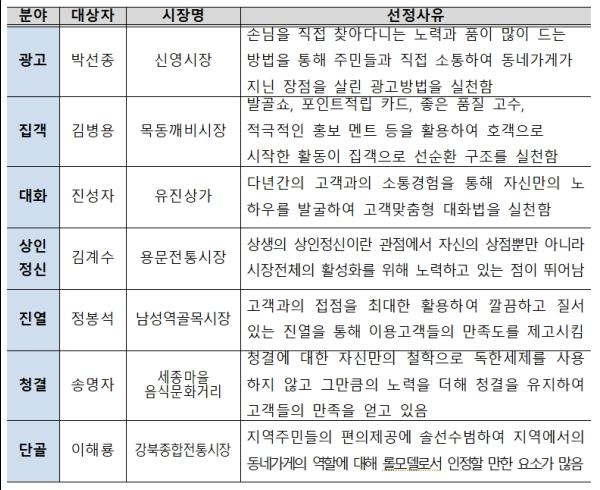 ‘집객’분야 김병용 상인은 정육분야 경력 25년의 베테랑으로 하루에 3~4시간씩 헤드마이크를 이용해 고객들의 발길을 끈다. 대형마트와는 달리 주인을 보고 상품을 신뢰하는 경우가 많은 전통시장 특성을 파악해 동네 부동산, 노인정을 돌며 발로 뛰는 홍보를 하는 ‘광고’분야 박선종 상인, 손님이 들어오면 무엇을 사러 왔냐보다 인사와 안부를 전하며 편안한 분위기를 조성하는 ‘대화’분야 진성자 상인도 올해 서울상인으로 선정됐다. 거동이 힘든 어르신에겐 상품 하나라도 직접 배달해 드리면서 가족의 안부를 챙기듯 손님의 일상을 챙기는 이해룡 상인은 ‘단골’분야 서울상인으로, 가장 깨끗한 세재는 부지런함이라며 건강한 청소로 항상 깔끔한 점포환경을 유지하는 ‘청결’분야 송명자 상인, 미세먼지를 비롯한 외부 접촉을 막기 위해 손이 많이 가더라도 소포장을 하고 좋은 상품은 상단에 올려 손님들이 골라가도록 하는 ‘진열’분야 정봉석 상인, 전통시장에 젊은 활기를 불어 넣고 활발한 상인회 활동을 통해 함께 시장을 발전시켜나가고 있는 ‘상인정신’분야 김계수 상인도 귀감을 줄 수 있는 모델이다.