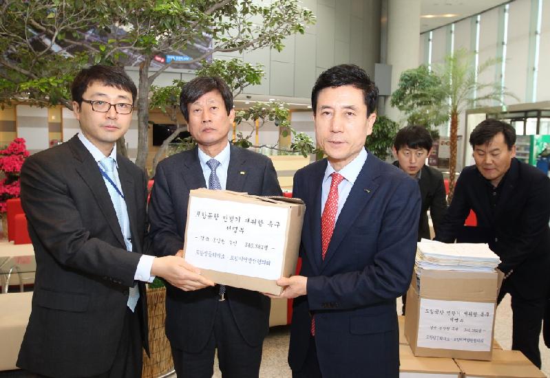포항공항 민항기 재취항을 촉구하는 경북 동남권 주민들의 염원이 담긴 서명부가 30일 국토교통부와 항공사에 전달됐다. 이날 포항시, 포항시의회, 포항상공회의소, 포항지역발전협의회는 국토교통부와 아시아나항공을 잇따라 방문해 35만여명이 참가한 서명부를 오전과 오후에 걸쳐 전달했다. 서명운동은 지난 2월 10일부터 포항상공회의소 등 경제계를 필두로 포항시 전역에서 진행돼 항공사 취항을 강력히 희망하는 서명에 35만여명이 동참했다. 이강덕 포항시장은 “세계적인 철강산업, 역사, 문화, 에너지 클러스트 및 천혜의 관광지인 경북 동해안 지역이 포항공항을 통해 다시 비상할 수 있는 적극적인 조치를 강력히 촉구한다”고 했다. 포항상공회의소 윤광수 회장은 “아시아나항공의 재취항 약속을 지키라는 시민들의 요구가 거세다”면서 “항공사측의 경제적 사유는 운항재개 후 논의하더라도 일단 운항을 먼저 재개하는 게 맞다”고 운항 재개를 강력히 요청했다.// 김희철 기자 khc4236@hanmail.net