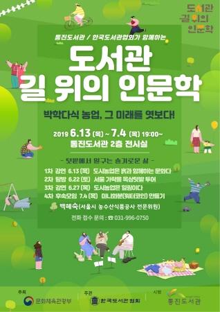 올해 통진도서관 ‘길 위의 인문학’은 도서관 특화 활성화의 일환으로 ‘박학다식 농업, 그 미래를 엿보다’를 주제로 선정하고, 도시농업·치유농업 등 전문가 강연과 현장탐방, 후속모임의 10회로 오는 6월부터 10월까지 운영한다.