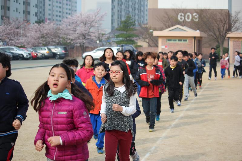 손목과 발목을 가볍게 푼 다음, 처음 한 바퀴는 조금 빠르게 걸어가며 몸에 열을 내고, 뒤이은 세 바퀴는 숨이 찰 정도로 빠르게, 마지막 바퀴는 속도를 낮추고 몸을 풀면서 마무리 했다. 아침 운동을 하게 되면 뇌에 혈액공급이 원활해져서 일이나 공부에 능률이 높아지고, 하루를 활기차게 시작할 수 있으며 스트레스 또한 낮춰주는 것으로 알려져 있다. 오늘 건강달리기를 하고 난 6학년 박지연 학생은 “평소에 달리기를 싫어하고, 다섯 바퀴나 뛴다고 해서 솔직히 자신이 없었지만, 친구들과 함께 뛰다보니 어느새 내가 다섯 바퀴를 다 돌아서 기쁘다. 안하던 운동에 숨이 차지만, 선생님들도 옆에서 뒤쳐진 아이들과 함께 뛰어주시니 힘이 난다.”라고 소감을 전했다.
