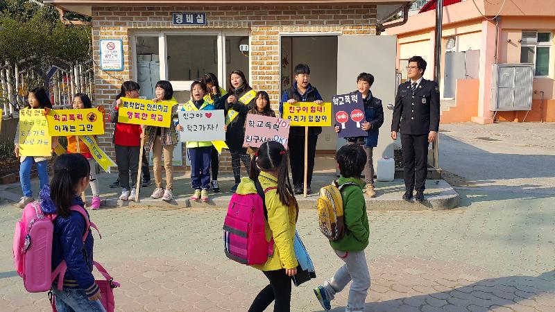 캠페인에는 학교전담경찰관, 교사, 전교어린이회 봉사위원 등 20여명이 참여하였다. 학생들은 직접 만든 학교폭력예방 피켓을 들고 ‘학교폭력! 멈춰!, 학교폭력! 이제는 그만!’이라는 구호를 힘차게 외치며 학교폭력을 예방하려는 마음을 다졌다.