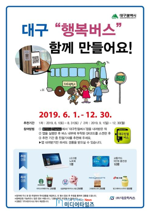 대구시는 6월 1일부터 12월 31일까지 버스이용시민이 직접 스마트폰으로 버스내부에 부착된 전자무늬(QR코드)를 스캔하여 친절기사를 추천받는다.
