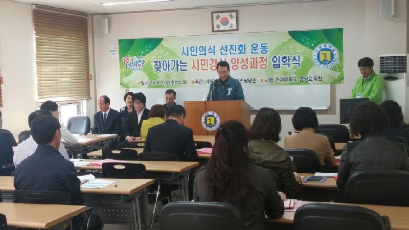 거제시(시장 권민호)와 거제대학교 평생교육원에서는 거제시 찾아가는 시민강사 양성과정 입학식을 지난 30일 오후 2시에 거제대학교 평생교육원 고현교육장에서 개최했다.