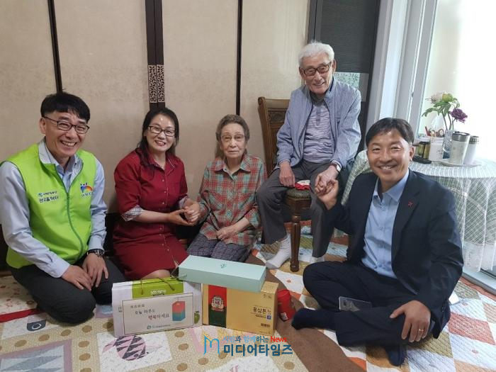 | 28일, 하안13단지에서 하안3동 3개 기관장들이 ‘100세 이상 어르신 방문 격려 및 선물 전달’을 마치고 기념촬영 하고 있다.(우측부터 김용진 동장, 이○○ 어르신 부부, 김재란 관장, 심경섭 소장) |
