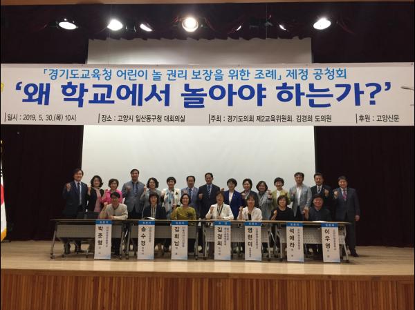 경기도의회 제2교육위원회 김경희 의원이 30일 고양시 일산동구청 대회의실에서 ‘경기도교육청 어린이 놀 권리 보장을 위한 조례’ 제정 공청회를 경기도내 교육지원청 초등교육담당 장학사와 학교 관계자 및 학부모 등 150여명이 참여한 가운데 개최했다.