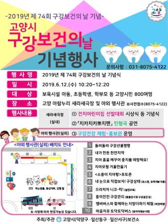 고양시 보건소는 구강보건의 날을 맞아 오는 6월 12일 오전 10시 고양 아람누리에서 ‘제74회 구강보건의 날 기념행사’를 개최한다.