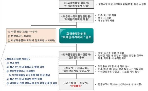 화학물질안전원은 심사를 마친 위해관리계획서의 이행을 점검하는 제도가 2018년 11월 29일부터 의무화됨에 따라, 지난 2015년부터 위해관리계획서 심사를 통과한 사업장 70곳을 대상으로 올해 3월부터 이행을 점검하고 있다. 앞으로 2021년까지 위해관리계획서 적합 사업장 약 1,000곳을 대상으로 이행을 점검할 예정이다.