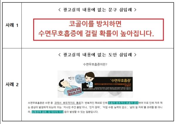 위반사례는 대부분 ‘이갈이로 인한 치아 손상 예방’, ‘코골이 방지 또는 완화’, ‘수면장애 예방’, ‘수면무호흡증 예방’ 등 의학적 효능을 표방해 공산품을 의료기기로 오인할 우려가 있도록 광고한 사례였으며, 그 밖에, 의료기기 광고 심의를 받은 내용과 다르게 심의 내용에 없는 문구나 도안을 삽입해 광고심의 관련 규정을 위반한 사례도 있었다.