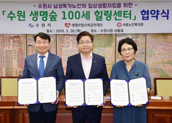 수원시와 서호노인복지관, 생명보험사회공헌재단은 5월 30일 시청 상황실에서 ‘수원 생명숲 100세 힐링센터 운영을 위한 협약’을 체결하고, 원활한 사업 추진을 위해 협력하기로 했다.