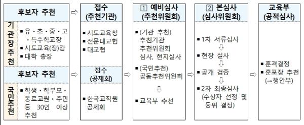 올해도 교육기관 추천과 국민 추천 총 45명이 추천되었으며, 심사위원회의 공적심사, 공개검증, 현지실사의 과정을 거쳐 공정하게 심사가 진행됐다.