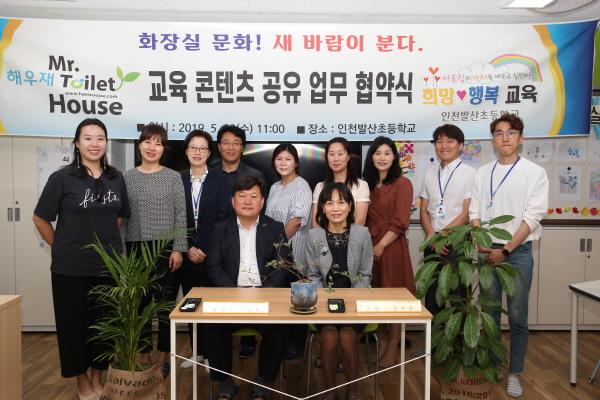수원시 화장실문화 전시관 ‘해우재’와 인천 발산초등학교는 지난 27일 발산초등학교 희망교실에서 ‘교육콘텐츠 공유 업무협약’을 체결하고, 발산초등학교 화장실개선사업에 적극적으로 협력하기로 했다.