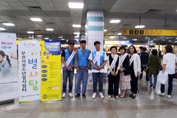 이날 오후 4시부터 두 시간 동안 부천시 아동여성안전 지역연대 유관기관 10곳과 원미·오정·소사경찰서, 청년자원봉사단체 청청봉사단 등 70여 명이 부천역을 비롯한 6개 지하철역사에서 동시다발적으로 캠페인을 진행했다.