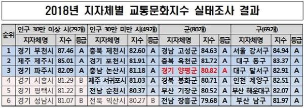 양평군은 국토교통부가 실시하는 ‘2018년 교통문화지수 평가’에서 우수지자체로 선정되어 기관표창 및 상금 100만원을 수상한다.