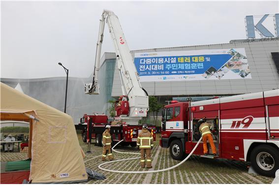 지난 30일 경기도에서 주최하고 고양시에서 주관하는 2019년 을지태극연습 실제훈련이 국제전시의 중심 킨텍스 제2전시장에서 개최됐다. 이날 연습은 기존 전시대비 연습에 다변화하는 시대에 발맞추기 위한 대형복합재난 위기대응훈련이 추가된, 포괄적인 안보개념의 훈련으로 진행됐다.