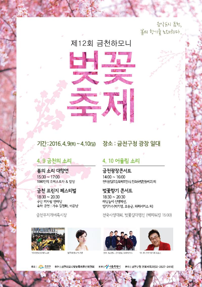 - 4월 9일(토)~10일(일)까지 구청 광장에서 프린지페스티벌, 벼룩시장, 사생대회, 해피워킹, 먹기리부스 등 다양한 행사 열려 “금천구 벚꽃축제는 여의도 벚꽃축제 만큼 유명하진 않아요. 하지만 여유있게 벚꽃을 구경할 수 있고, 매년 천명이 넘는 주민들이 참여하는 오케스트라가 관람객의 눈과 귀를 사로잡고 있습니다.”금천구의 벚꽃길은 많이 알려져 있진 않지만 서울시가 봄꽃길 명소로 선정한 안양천 제방길, 벚꽃로 등은 숨은 벚꽃 명소로 점차 인기를 얻고 있다. 금천구 대표적인 벚꽃길인 ‘벚꽃로’는 금천구청역에서 가산디지털단지역까지 총 3.1킬로미터 구간에 20여 년 된 639주의 벚꽃이 펼쳐져 있는 서울시에서 손꼽히는 드라이브 코스다. 또 ‘안양천 제방길’은 시흥대교에서 철산교에 이르는 10킬로미터 구간으로 대형 벚나무가 우거져 주민들의 운동 및 산책로로 애용되고 있다.