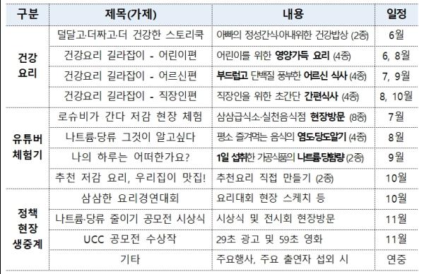 주요 내용은 ,방송작가·유튜버와 함께하는 건강한 식문화 소통포럼, 누구나 쉽게 따라하는 ‘덜달고·덜짜고 건강한 요리 이야기’, 유튜버가 알려주는 생활 속 저염 체험현장 등이다.
