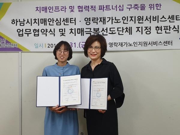 하남시 치매안심센터는 지난달 31일 영락재가노인지원서비스센터에서 영락재가노인지원서비스센터와 치매인프라 및 협력적 파트너십 구축을 위한 업무협약을 맺고 제4호 치매극복 선도단체로 지정했다고 3일 밝혔다.