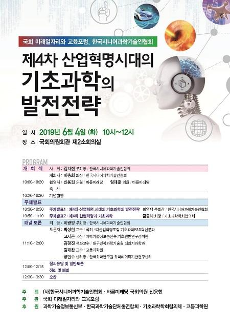 바른미래당 신용현 의원이 오는 4일 오전 9시 30분부터 국회의원회관 제2소회의실에서 한국시니어과학기술인협회와 공동주최하며, 국회 미래일자리와 교육포럼이 주관으로 참여한 ‘제4차산업혁명시대의 기초과학의 발전전략’ 토론회를 개최한다.