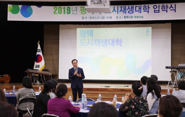 평택시는 지난달 31일 정장선 평택시장과 평택시의회 김승겸 산업건설 위원장, 입학생과 관계자 등 100명이 참석한 가운데 ‘2019년 제 5회 평택시 도시재생대학 입학식’을 개최했다.평택시는 시민들에게 시에서 추진하고 있는 도시재생사업과 뉴딜정책에 대한 이해를 돕고자 2015년부터 매년 도시재생대학을 운영하고 있다.