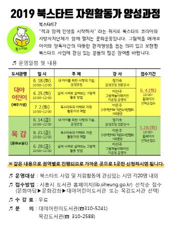 이번 자원활동가 양성과정은 대야어린이도서관, 목감도서관 2개 도서관에서 진행된다. 기존 자원활동가나 북스타트 자원활동에 관심있는 시민 모두 참여 가능하다. 접수는 시흥시 도서관 홈페이지를 통해 선착순으로 진행된다. 교육과정은 북스타트의 이해와 함께 아이와의 의사소통 비결, 그림책과 책놀이 방법에 대한 강의로 구성되며, 수강 이후 자원활동 참여도 가능하다.