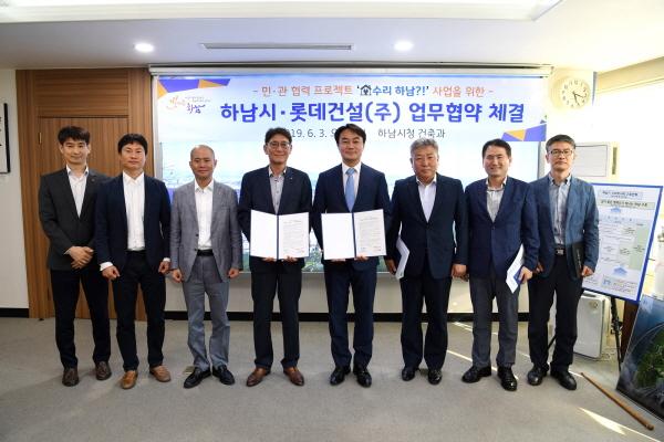 하남시는 지난 3일 시장실에서 민·관 협력 프로젝트 ‘수리 하남?’ 사업을 위해 ㈜롯데건설과 업무협약식을 체결했다고 밝혔다. 이날 협약식에는 김상호 하남시장, ㈜롯데건설 건축사업부 선우환호 상무를 비롯해 관계자 8명이 참석했다.