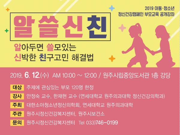 ‘알쓸신친: 알아두면 쓸모있는 신박한 친구고민 해결법’을 주제로 열리는 이번 강좌에서는 원주세브란스기독병원 정신건강의학과 안정숙·한재현 교수를 초청해 부모는 아이의 바람직한 친구 관계를 위해 어떻게 도와줄 수 있을지에 대해 강연을 진행한다.