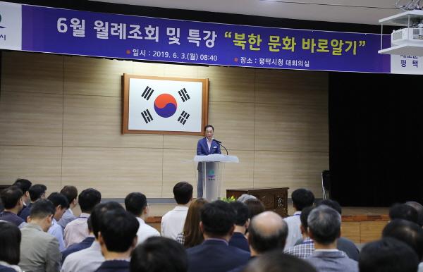 평택시가 지난 3일 특강 ‘북한 문화 바로알기’라는 이색적인 주제로 6월 월례조회를 개최해 참석한 직원들로부터 좋은 호응을 얻었다.