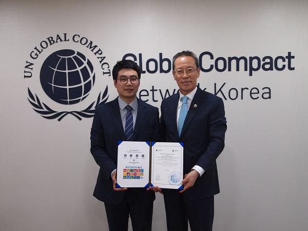 지난 3일 유엔글로벌콤팩트 한국협회 서울 서소문로 사무실에서 이종현 EMC 대표, 박석범 유엔글로벌콤팩트 한국협회 사무총장 등 관계자들이 참석한 가운데 회원가입을 기념하는 가입증서 전달식을 가졌다.