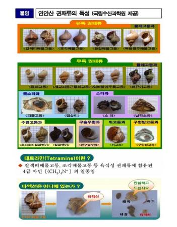 특히 권패류 중 일부 종은 자연독소를 함유해 섭취 시 두통, 어지러움, 멀미감, 구토, 시각장애 등을 일으키는 것으로 알려져 있어 주의가 필요하다.