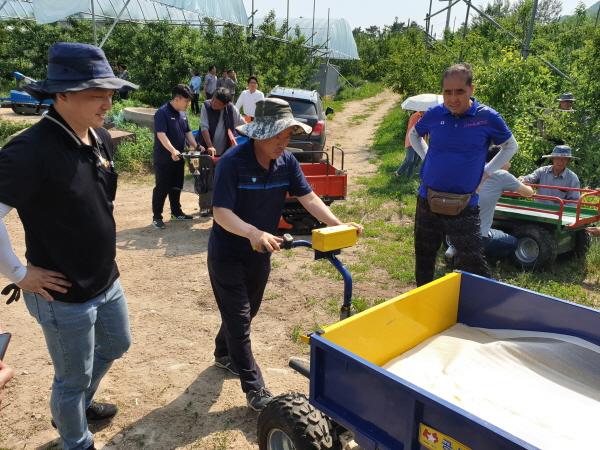 일동사과작목반 20여 농가와 공급업체가 참석한 시연회에서는 참여업체가 농업용동력운전차, 전동가위, 농작업 안전보조구 등과 관련해 업체별 생산장비의 장단점을 설명하고 직접 시연을 실시했다.