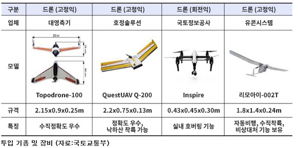 이번 시연에는 유콘시스템 등 국내 드론제조사가 개발한 고정익 드론 3~4kg급과 일부 해외제품도 투입해 임무 수행에 적합한 모델을 확인해나갈 계획이다.